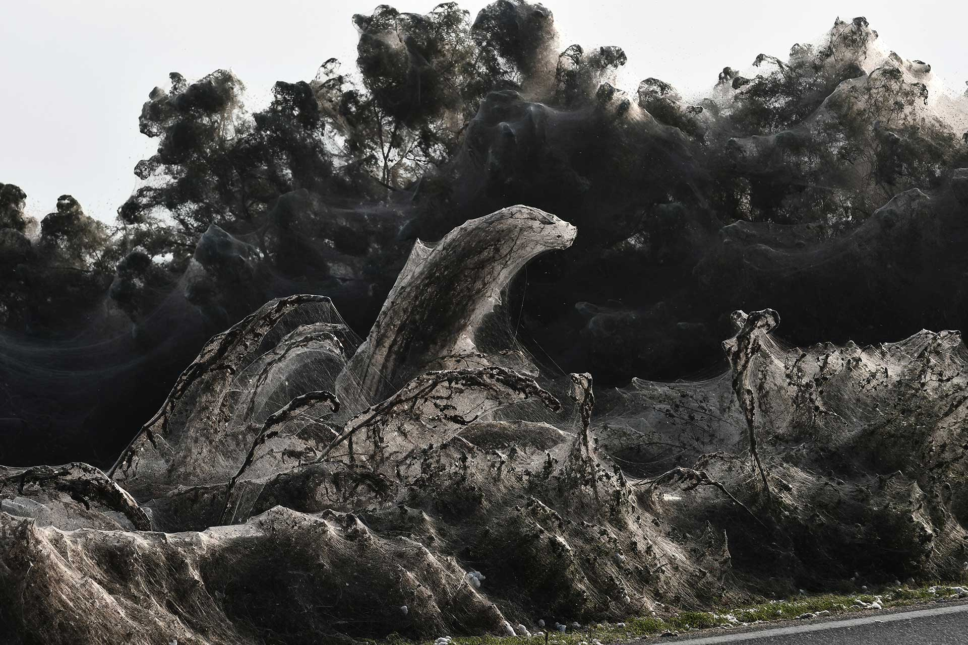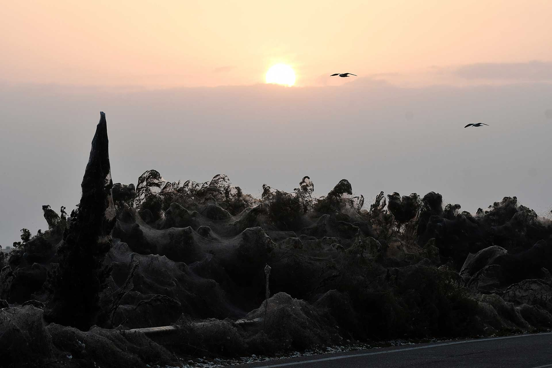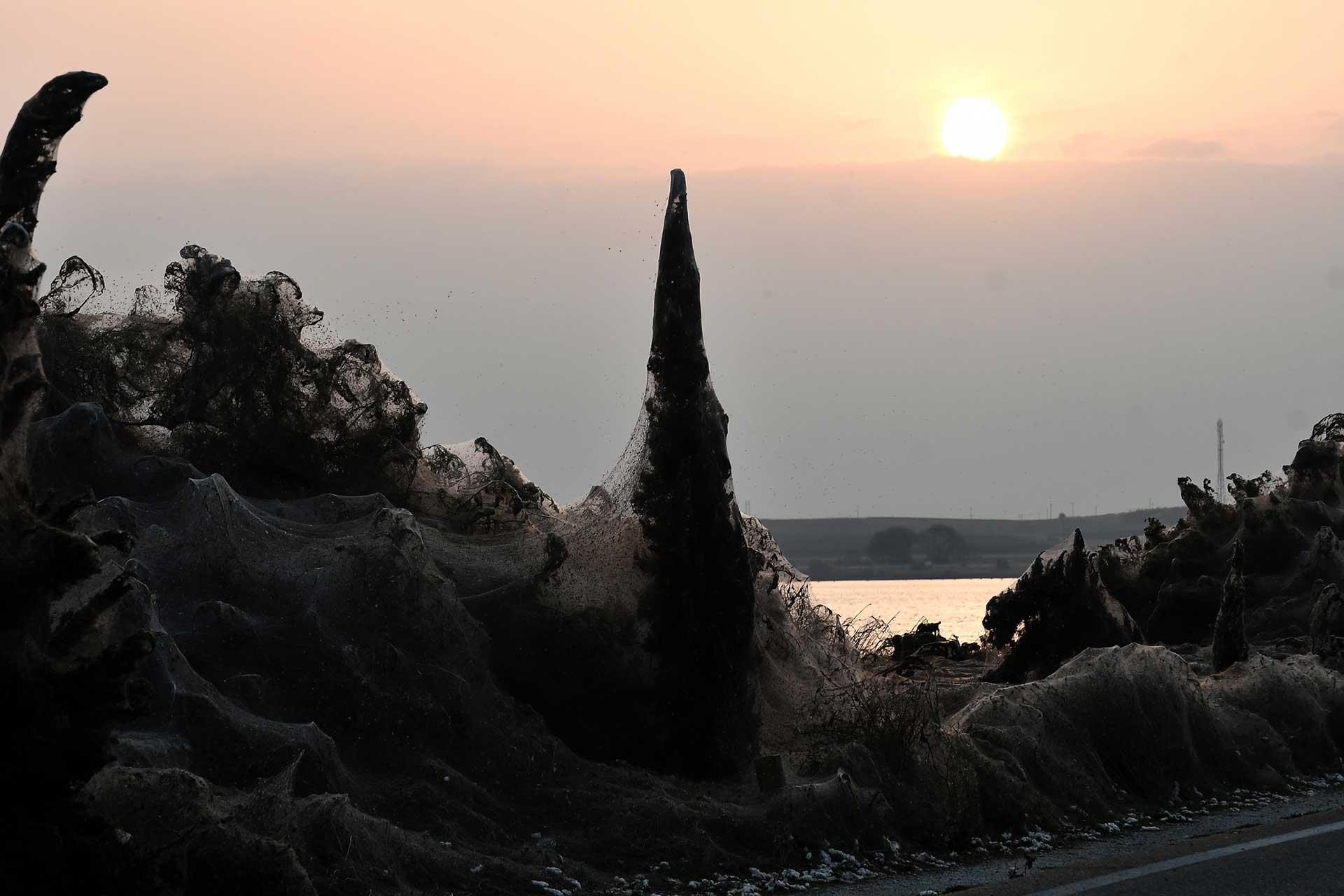 La gigantesca seda arácnida ha tapado la vegetación, desde arbustos hasta árboles, así como vallas y muros e incluso algunos santuarios de carretera típicos del país.