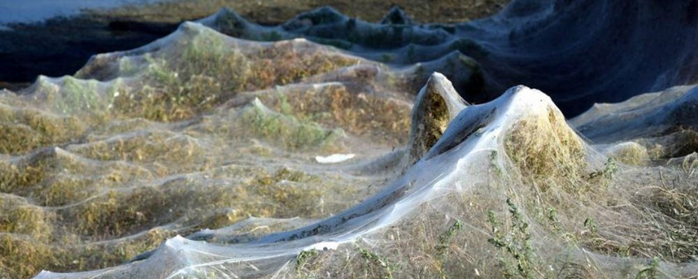 La gigantesca seda arácnida ha tapado la vegetación, desde arbustos hasta árboles, así como vallas y muros e incluso algunos santuarios de carretera típicos del país.