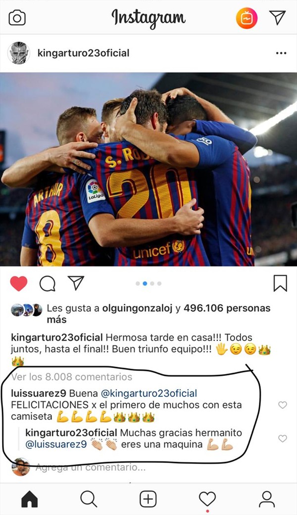 ACTITUD FUTURO Luis Suárez le escribió mensaje a Arturo Vidal tras la goleada del Barcelona al Real Madrid Ambas fueron las figuras en el clásico español. Por Hector Muñoz Tapia | 29 Oct, 2018. 09:50 hrs Ambas fueron las figuras en el clásico español. Arturo Vidal coronó la goleada de 5-1 del Barcelona ante el Real Madrid en el Camp Nou, pero sin duda buena parte del triunfo pasó por los pies de Luis Suárez. El uruguayo marcó un triplete y fue la gran figura ante la ausencia de Lionel Messi, ausente por lesión. A pesar de su protagonismo, Suárez le dedicó unas palabras al Rey en su cuenta de Instagram:»Felicitaciones por el primero de muchos con esta camiseta». Vidal le agradeció por su palabras y lo tildó de «máquina» por su gran partido. Arturo Vidal Barcelona Luis Suárez La aplaudida reacción de una periodista con un sujeto que la acosó durante una transmisión Cher disparó con todo en contra de Bolsonaro: "Es un cerdo, ¡debería estar encerrado en prisión por el resto de su vida!" Sigue a FUTURO.cl en Google Discover Recibe nuestros contenidos directamente en tu feed. Seguir en Google Contenido patrocinado