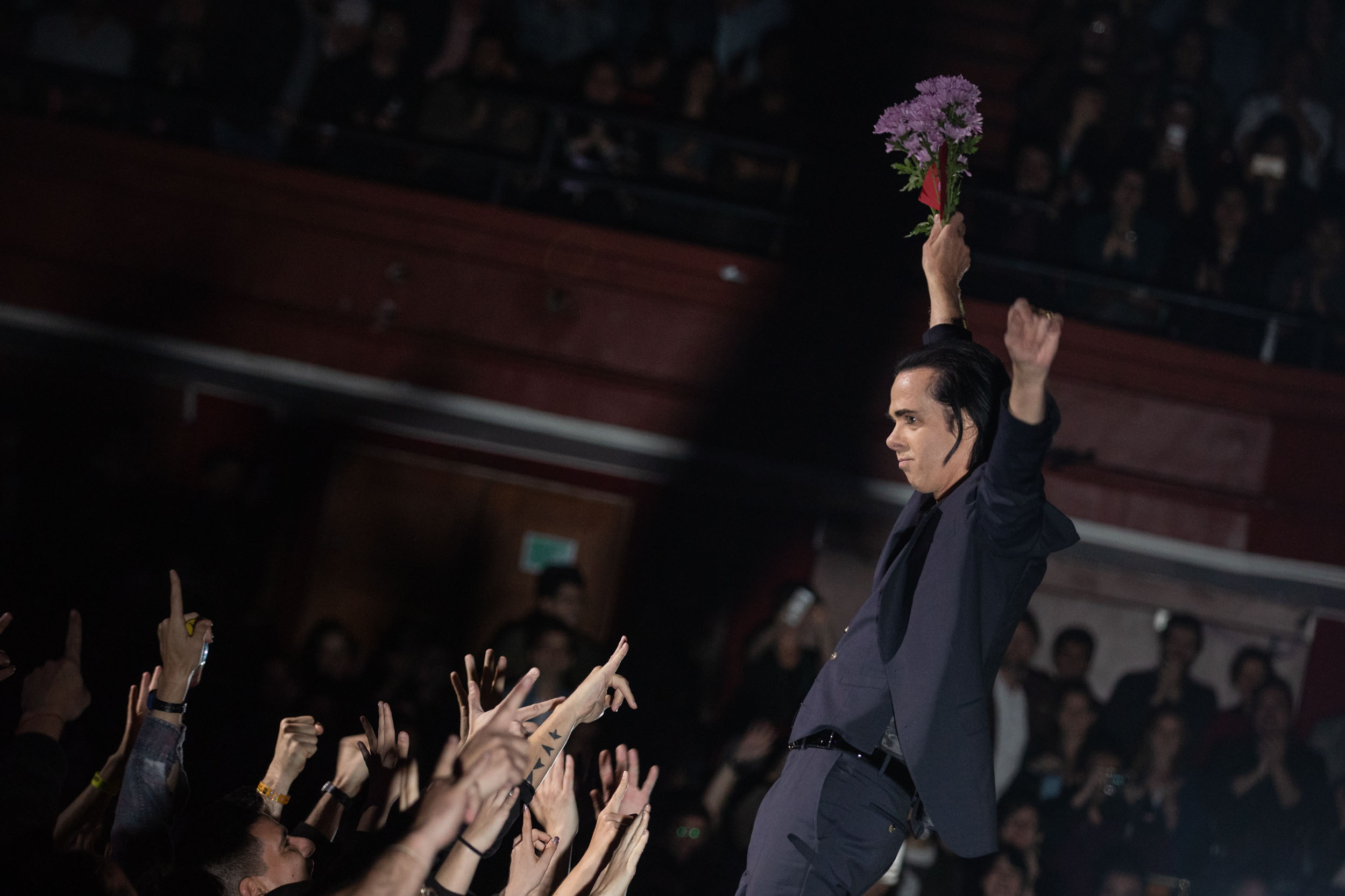 Es cierto, cuesta encontrar las palabras cuando la liturgia llega con igual intensidad a todos los que repletan el Teatro Caupolicán la noche del viernes 5 de octubre. Desde las primeras filas de unos asientos que no fueron necesarios desde el primer instante del arranque del show hasta la última fila de la galería, que te permitía mirar la catarsis con perspectiva. Aun así, todo lo que imaginaste se destruye cuando el reloj marca las 21:15 y se apagan las luces para mantener una ambientación con sombras para la llegada en escena de los seis músicos de los Bad Seeds y el arribo de Nick Cave, el poeta maldito que a sus 61 años viene saliendo de la pena más profunda que un ser humano puede experimentar. Cave no se echa a morir y prefiere exorcizar todos los demonios, partiendo por los propios. Recorre el escenario de principio a fin, nunca deja la primera línea y estrecha manos y cruza miradas con el primer sector que ya perdió todo tipo de formalidad.