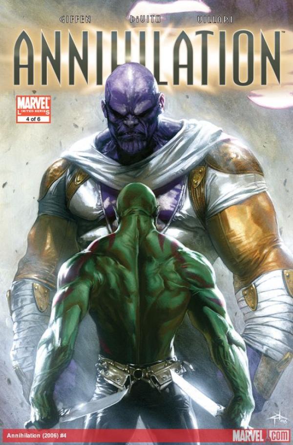 Aquí hay una portada de un número del cómic Annihilation donde podemos ver a Thanos sin su armadura frente a Drax, el Destructor, a quien ya no veremos en Avengers 4 pues se hizo polvo: