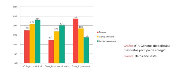 Pese a ello, las preferencias varían según establecimiento educacional. Mientras en colegios particulares se prefiere más el drama, en los liceos municipales se opta más por las cintas de acción y aventura.