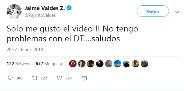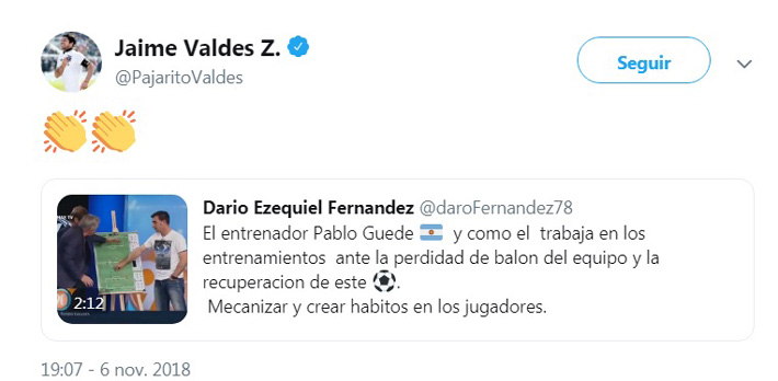 ACTITUD FUTURO Jaime Valdés recordó con aplausos video de Pablo Guede y se ganó críticas hinchas A través de su cuenta oficial de Twitter, el volante destacó una publicación donde el ex DT de Colo Colo explicaba su trabajo, generando controversia en redes sociales. Por Diego Puebla Hernández | 07 Nov, 2018. 16:47 hrs A través de su cuenta oficial de Twitter, el volante destacó una publicación donde el ex DT de Colo Colo explicaba su trabajo, generando controversia en redes sociales. Controversia generó una reacción que tuvo el experimentado volante de Colo Colo, Jaime Valdés, al destacar un antiguo video de táctica de Pablo Guede. A través de su cuenta oficial de Twitter, «Pajarito» recordó con aplausos ante una publicación en la que el ex DT del Cacique explicaba cómo trabajaba la recuperación de la pelota en sus equipos. Su reacción le valió ganarse una serie de críticas de parte de los hinchas albos, quienes le reprocharon que no era oportuno hacer eso en medio de la crisis que atraviesa el equipo dirigido por Héctor Tapia. Ante esto, el ex Atalanta escribió un tuit en el que aseguró que sólo le gustó la publicación. «Solo me gustó el video!!! No tengo problemas con el DT….saludos», fue el último mensaje de Valdés. Mira aquí las publicaciones del centrocampista que generaron ruido. jaime valdés Álvaro Henríquez lanzará con firma la re-edición de su disco solista Jonathan Davis afirma que bandas como Limp Bizkit, Korn o Deftones fueron la última gran ola del rock Sigue a FUTURO.cl en Google Discover Recibe nuestros contenidos directamente en tu feed. Seguir en Google Contenido patrocinado