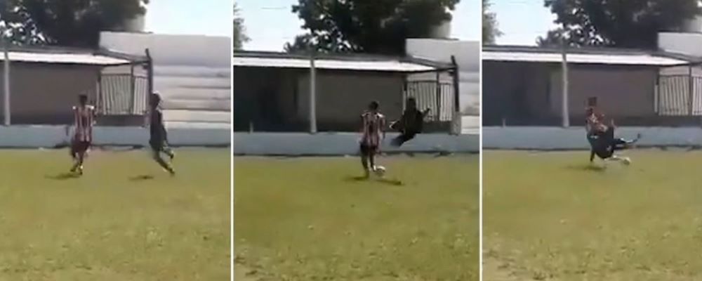En las redes sociales se han hecho virales las imágenes de una brutal patada voladora que un joven futbolista le propinó a uno de sus rivales durante un partido en Argentina.