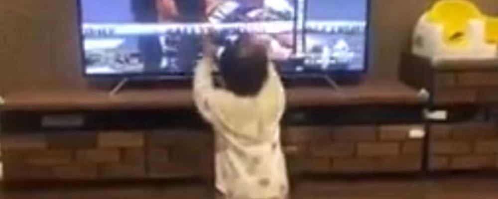 El boxeador, al haber noqueado a su contrincante, eleva los brazos en señal de celebración. Entonces el niño, a pesar de su corta edad, parece entender lo que ese gesto significa y se pone a saltar y a dar palmas delante de la televisión en muestra de felicidad.