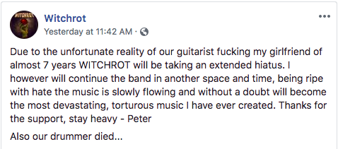 «Debido a la desafortunada realidad de nuestro guitarrista follando con mi novia de casi 7 años, WITCHROT tomará una pausa prolongada», dice el post, que está firmado por un individuo llamado Peter. Continúa diciendo que está «enterrando el odio» y que está a punto de escribir algo de «música devastadora y tortuosa que jamás ha hecho». Ah, y el baterista de la banda murió.