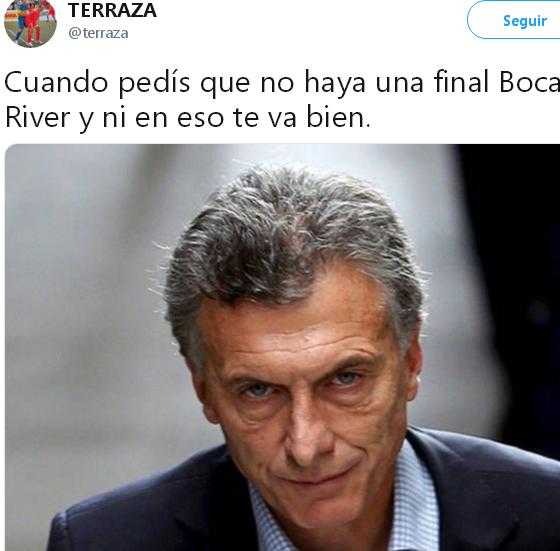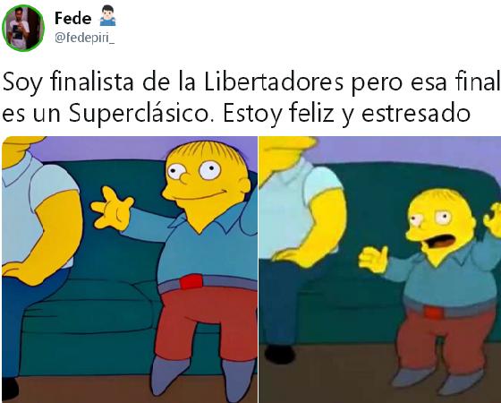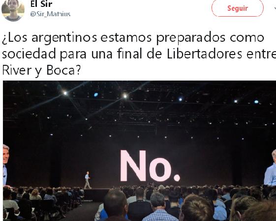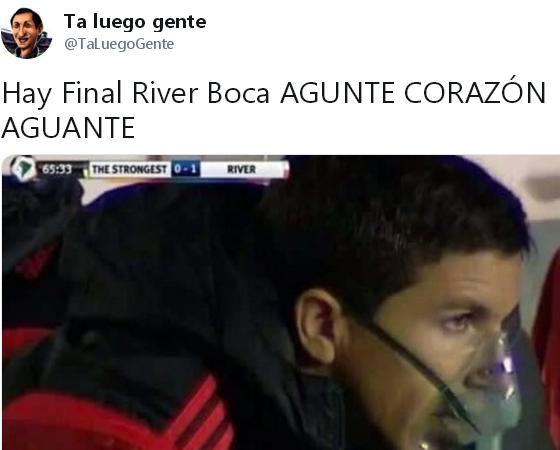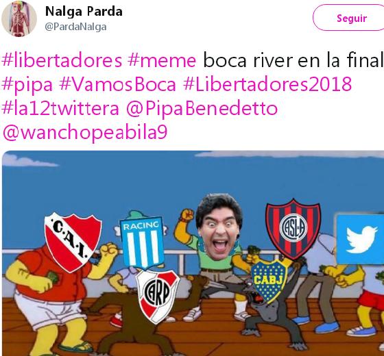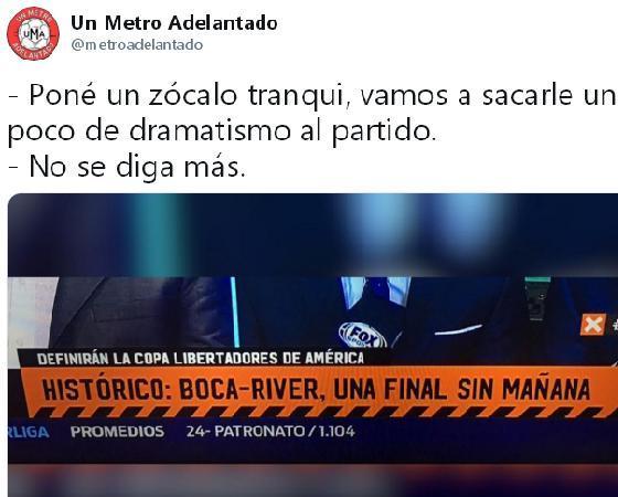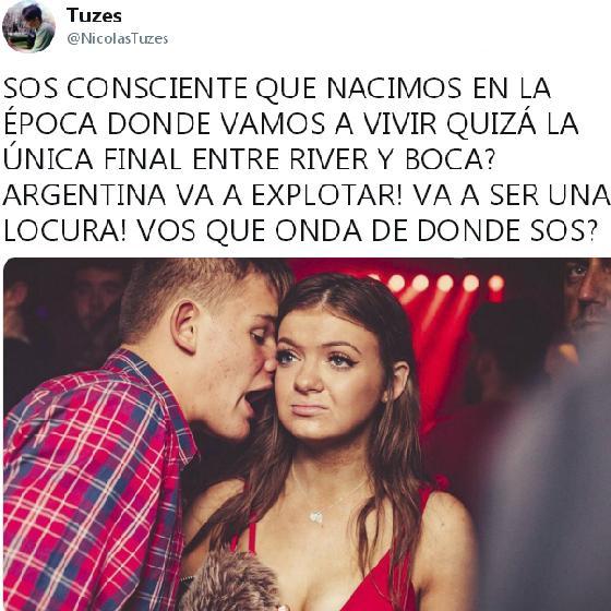 ACTITUD FUTURO Los divertidos memes que comparan el partido River-Boca con el fin del mundo Los hinchas ya palpitan la final de la Copa Libertadores que comienza este sábado. Estos son las imágenes más destacadas. Por Diego Puebla Hernández | 05 Nov, 2018. 12:28 hrs Los hinchas ya palpitan la final de la Copa Libertadores que comienza este sábado. Estos son las imágenes más destacadas. La ironía, las exageraciones y el humor negro siempre están presentes en las redes sociales y esta vez no fue la excepción. Desde que se confirmó la final de la Copa Libertadores entre Boca y River, los usuarios comenzaron a anticipar lo que sin dudas será un suceso histórico. Los más “reservados” prevén un encuentro infartante. Los más extremos, en cambio, anuncian un duelo violento y hasta se animan a comparar este choque con el Apocalipsis. A continuación, los memes más creativos: boca juniors River Plate Las Chaquetas Amarillas presenta "Auto de mi calle", adelanto de su próximo disco Guns N' Roses se escapó a un cine VIP en México para ver la película "Bohemian Rhapsody" Sigue a FUTURO.cl en Google Discover Recibe nuestros contenidos directamente en tu feed. Seguir en Google Contenido patrocinado