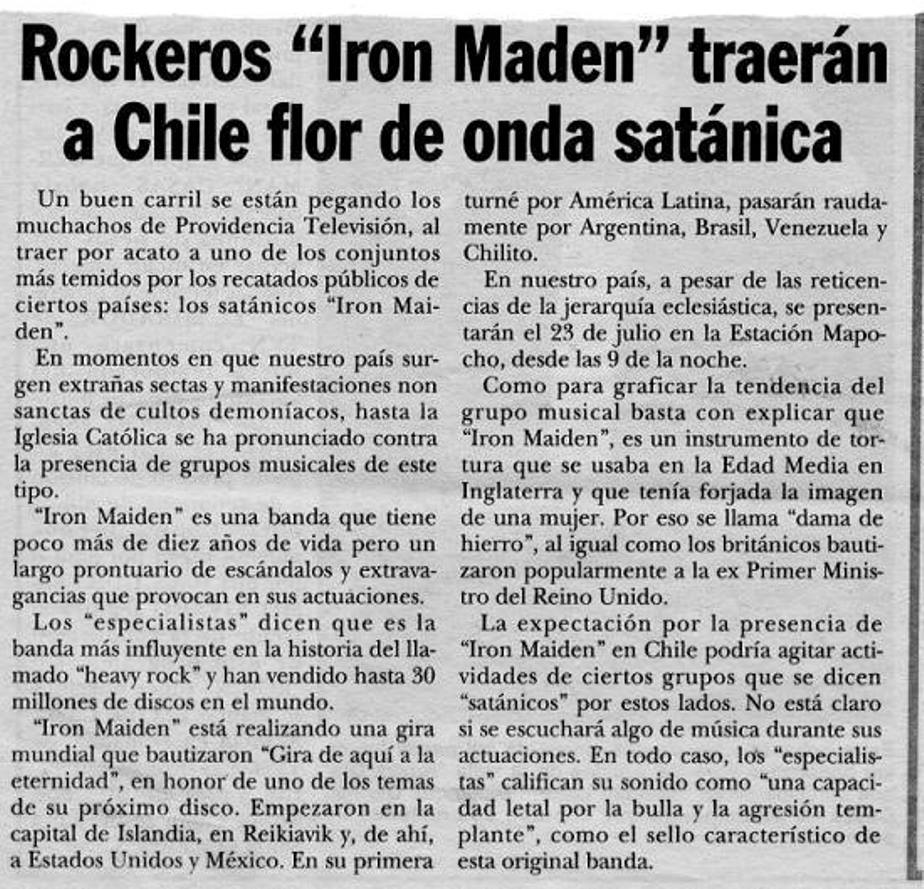 Pero también la historia de Iron Maiden en Chile ha tenido momentos no tan brillantes. Han sido 2 veces las que no han podido entrar al país: en 1992, por influencia de la iglesia católica, donde no pudieron tocar en la Estacion Mapocho, y en 1998, donde fueron obligados a bajarse del Monsters of Rock por el clima político existente tras la detención del dictador Augusto Pinochet en Londres.