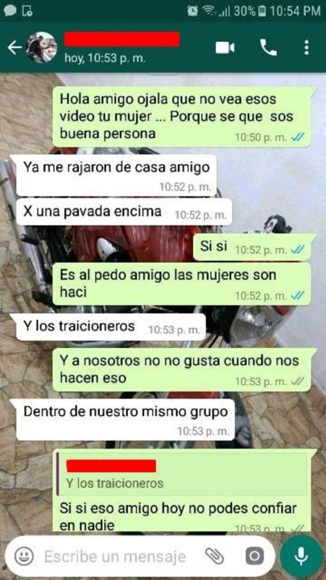 La mujer que recibió las fotos y videos de la fiesta se encargó de reenviarlos a todos sus contactos, incluyendo las esposas de los acusados, señalando que los hombres le pidieron guardar el secreto, pero no les hizo caso y decidió funarlos. «Lo primero que hicieron, Mati obviamente, fue decirme que ‘por favor no haga nada’. Que ‘por favor no viralice el video’. ¿Podés creer? ¿Tan Soretes son?», expresó en un audio de WhatsApp.