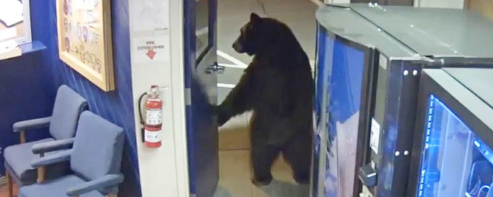 Las imagenes muestran a un oso que, tras abrir la puerta sin ninguna dificultad, parándose sobre sus patas traseras, entró en la estación de la patrulla de caminos, pasó por las máquinas expendedoras y se dirigió al fondo de la sala. Luego de un rato, volvió a aparecer en la toma, tranquilamente abrió la puerta de nuevo y salió del edificio.
