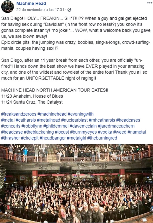 Noticias Pareja fue expulsada de un concierto de Machine Head por tener relaciones sexuales en primera fila La banda se refirió a la situación y dijeron que fue "completamente alocada". Por Hector Muñoz Tapia | 26 Nov, 2018. 09:56 hrs La banda se refirió a la situación y dijeron que fue «completamente alocada». Hace unos días, una pareja tuvo que ser expulsada de un concierto que se realizaba en San Diego, Estados Unidos, por tener relaciones sexuales en la primera fila. La bochornosa situación ocurrió en medio de la gira de despedida de Machine Head, quienes recibieron mucho más que amor en el show. La propia banda confirmó la noticia en sus redes sociales, donde aplaudieron la energía que tuvo el público a lo largo del recital, además de resaltar que el incidente era un indicio de un concierto «completamente alocado». Machine Head pareja Hinchas de la U terminado el partido criticaron a Heller y agredieron a Ronald Fuentes Hincha de River Plate pidió perdón a fanáticos de Boca Juniors Sigue a FUTURO.cl en Google Discover Recibe nuestros contenidos directamente en tu feed. Seguir en Google Contenido patrocinado