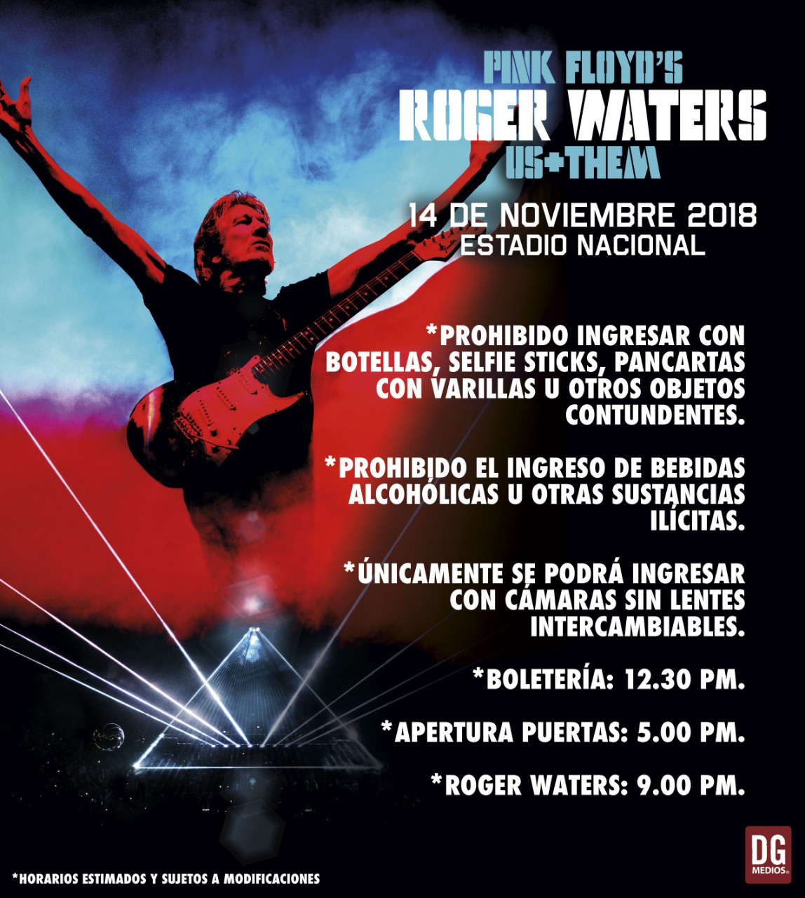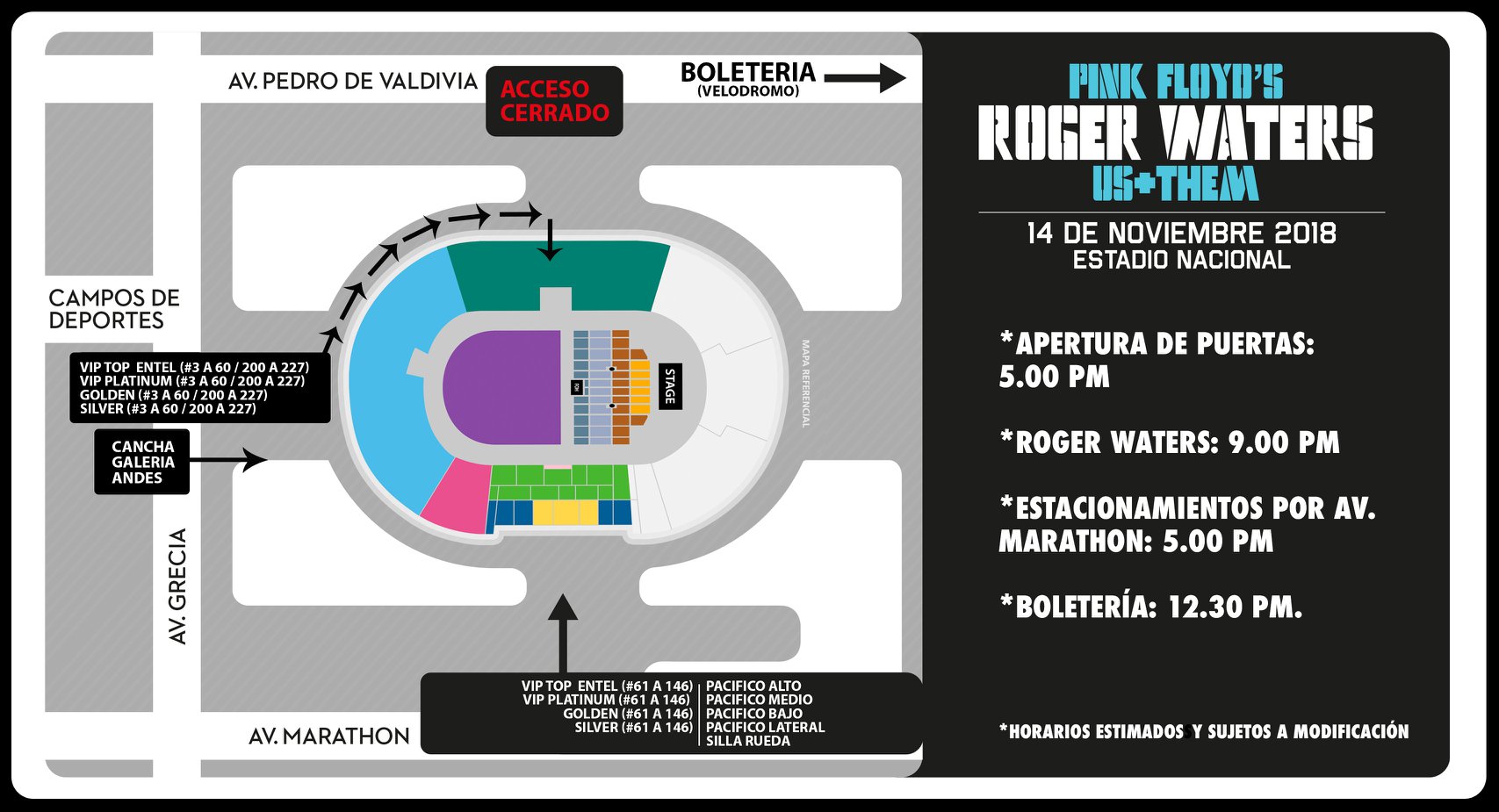 Noticias Roger Waters en Chile: Horarios y recomendaciones El ex Pink Floyd estará tocando este miércoles 14 de noviembre en el Estadio Nacional. Por Hector Muñoz Tapia | 13 Nov, 2018. 09:23 hrs El ex Pink Floyd estará tocando este miércoles 14 de noviembre en el Estadio Nacional. Y finalmente llegó la semana del regreso de Roger Waters a Chile. El ex Pink Floyd toca este miércoles 14 de noviembre en el Estadio nacional. Antes de la jornada en que veremos el show que el músico gira pro el mundo en la Us + Them Tour, la producción a cargo liberó información de horarios y accesos para el recinto de Ñuñoa. Las puertas del Estadio Nacional se abrirán a las 17 hrs, y el concierto de Roger Waters comenzará a las 21 hrs y se recomienda llegar con una hora de anticipación para una ubicación óptima. Revisa el mapa con los accesos a continuación… Estadio Nacional Roger Waters Medio español asegura que Alexis fue ofrecido al Madrid El nuevo adelanto de "Super Smash Bros. Ultimate" funciona con cualquier canción Sigue a FUTURO.cl en Google Discover Recibe nuestros contenidos directamente en tu feed. Seguir en Google Contenido patrocinado
