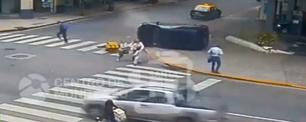 La cadena de peligros comenzó cuando un furgón entró en la vereda, chocó y volcó muy cerca del lugar en el que se encontraban. Con la inercia, el vehículo derribó un semáforo y rodó hacia esas personas.