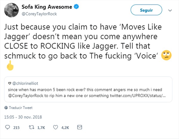 Una vez que Corey Taylor se enteró de lo dicho por el líder de Maroon 5, este arremetió en su contra a través de Twitter, manifestando que «aunque Levine diga que ‘se mueve como Jagger’ nunca ha estado ni cerca de rockear como Jagger. Que alguien le pida a ese imbécil que se regrese a ‘The Voice'».