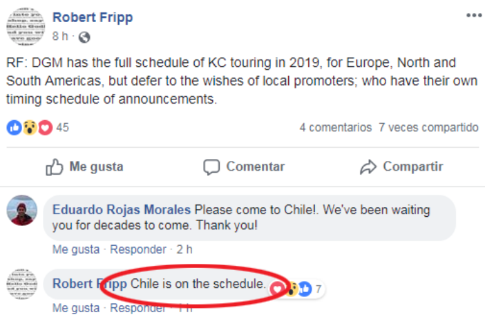 Noticias King Crimson vendría a Chile en 2019, según Robert Fripp Así lo aseguró el líder de la banda en su perfil de Facebook. Por Hector Muñoz Tapia | 06 Dic, 2018. 12:32 hrs Así lo aseguró el líder de la banda en su perfil de Facebook. Una de las grandes bandas que falta por ver en Chile es King Crimson. Desde que volvieron al ruedo con nueva y reforzada formación a mediados de esta década, han dado shows espectaculares por Europa y Norteamérica, pero pasar pro estos lados. Algo que podría cambiar el próximo año. En 2019 King Crimson festeja su aniversario 50 con gira mundial y, según el mismo Robert Fripp contó en su perfil de Facebook, tienen contemplado llegar a Sudamérica, con un paso por Chile. Respondiendo a fans que consultaban su acaso nuestro país sería incluido, Fripp contestó «Chile está en carpeta». Chile King Crimson Robert Fripp Chris Jericho de Fozzy: "Es nuestra misión destruir a Iron Maiden en nuestro próximo concierto" ¡Vuelve Celebrity Deathmatch con temporada 2019! Sigue a FUTURO.cl en Google Discover Recibe nuestros contenidos directamente en tu feed. Seguir en Google Contenido patrocinado