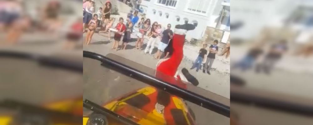 En el video, que rápidamente se volvió viral en las redes sociales, podemos ver un barco que se acerca a la orilla de una playa, y desde el cual intenta bajar Santa Claus, con tan mala suerte que termina protagonizando una estrepitosa caída.