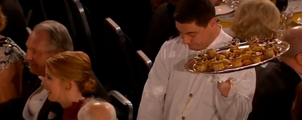 El incómodo momento comienza cuando el mesero, ubicado detrás de los comensales, se encuentra listo para servir los canapés pero antes de empezar se rasca ligeramente la parte posterior de su cabeza, inclina la bandeja de plata y deja caer uno de los bocadillos.