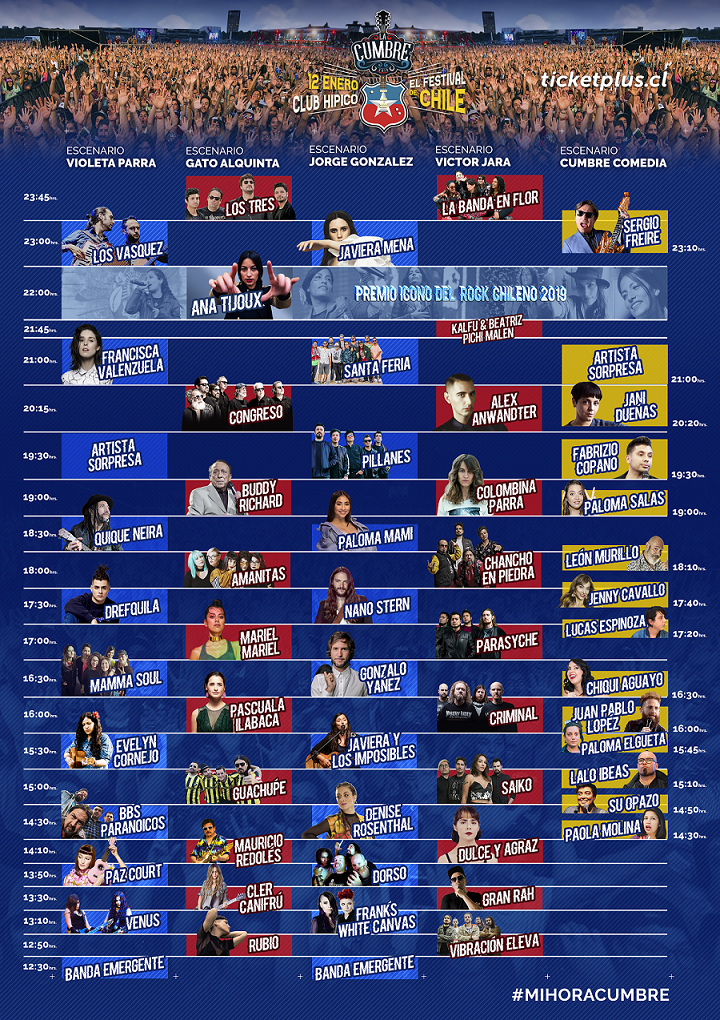 La Cumbre 2019 el primer cartel paritario de la cartelera nacional y que este año entregará el Premio Icono del Rock Chileno a Ana Tijoux, entre otros momentos esperados como la celebración de los cincuenta años del grupo Congreso, el regreso a los grandes escenarios de Álvaro Henríquez liderando a Los Tres, el estreno de un escenario de comedia y destacados exponentes del stand-up comedy, la vigencia de Buddy Richard y los debuts de Paloma Mami, Pillanes y Los Vásquez por primera vez en un festival capitalino. Está será la sexta edición y tercera en año consecutivo (2007, 2009, 2012, 2017, 2018). Entradas a la venta en sistema Ticketplus.cl