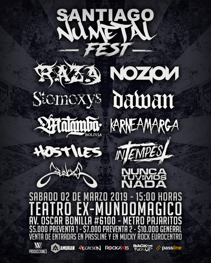 Noticias Santiago Nu Metal Fest confirma su realización – Sábado 2 de marzo, Ex Teatro Mundo Mágico El evento reunirá a 10 bandas de este estilo en un encuentro que busca potenciar este estilo en nuestro país. Por Jorge Lagas | 27 Dic, 2018. 17:37 hrs Un evento de rock nacional para los próximos meses: se confirmó el Santiago Nu Metal Fest, que reunirá a varias bandas de este estilo, como Raza, Nozion, Stomoxys y otras, en total 10 bandas de nu metal. La cita es el sábado 2 de marzo en el ex Teatro Mundo Mágico. Entradas: Passline, a $5.000 la primera preventa. Después estarán en Preventa 2 a $7.000 y en Venta General a $10.000. nu metal Publican documental de la final de la Libertadores entre Boca-River contado desde las hinchadas Cleaver libera su nuevo videoclip "Let Me Fly" Sigue a FUTURO.cl en Google Discover Recibe nuestros contenidos directamente en tu feed. Seguir en Google Contenido patrocinado