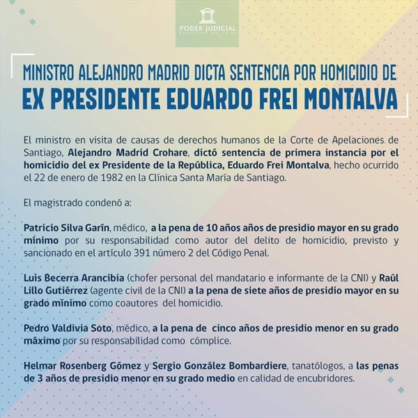 ACTITUD FUTURO Caso Frei Montalva: seis personas condenadas por el homicidio del expresidente El médico Patricio Silva fue sentenciado a diez años de cárcel. Por Hector Muñoz Tapia | 30 Ene, 2019. 15:32 hrs El médico Patricio Silva fue sentenciado a diez años de cárcel. Por ADN.cl El juez Alejandro Madrid declaró culpables a los seis procesados por el homicidio del ex Presidente de la República Eduardo Frei Montalva, fallecido el 22 de enero de 1982. El magistrado condenó en calidad de autores al médico Patricio Silva (10 años de cárcel); a Luis Becerra (7 años), ex chofer de la familia Frei e informante de la CNI; y a Raúl Lillo (7 años), ex agente de la DINA. Además, el médico Pedro Valdivia fue condenado como cómplice (5 años) y, como encubridores, los médicos patólogos Helmar Rosenberg y Sergio González (ambos 3 años). Edurado Frei Montalva Los Borbotones: el día en que "Los Simpson" homenajeó el concierto en la azotea de The Beatles Skid Row sobre "Slave To The Grind": "Nuestro público femenino bajó un 45% después de lanzar el disco" Sigue a FUTURO.cl en Google Discover Recibe nuestros contenidos directamente en tu feed. Seguir en Google Contenido patrocinado