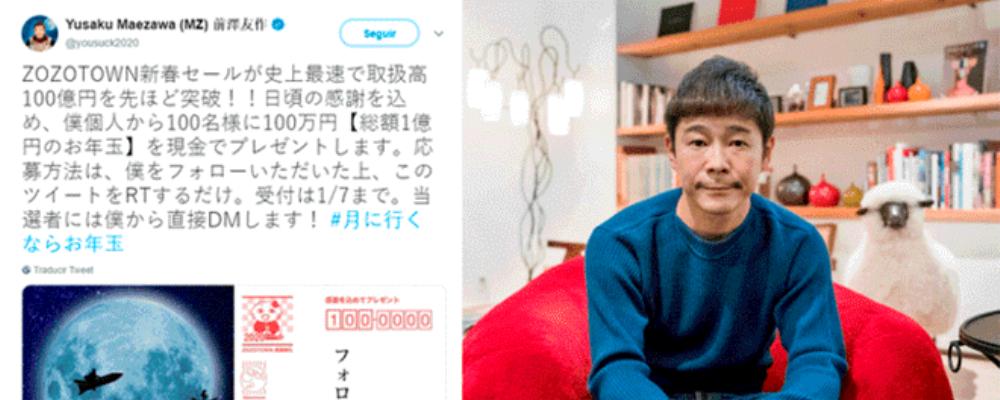 Tal como describe Yusaku Maezawa en su cuenta de Twitter, él prometió repartir 100 millones de yenes (cerca de US$ 1 millón) entre 100 personas al azar que retuiteran su publicación. «Para participar, todo lo que tienes que hacer es seguirme y RT (compartir) este tuit», señaló en su red social.
