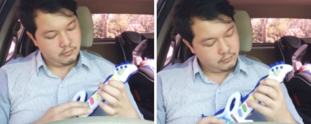 Un hombre sobre su auto, se grabó intentando tocar una guitarra de juguete para posteriormente subirlo a sus redes sociales.