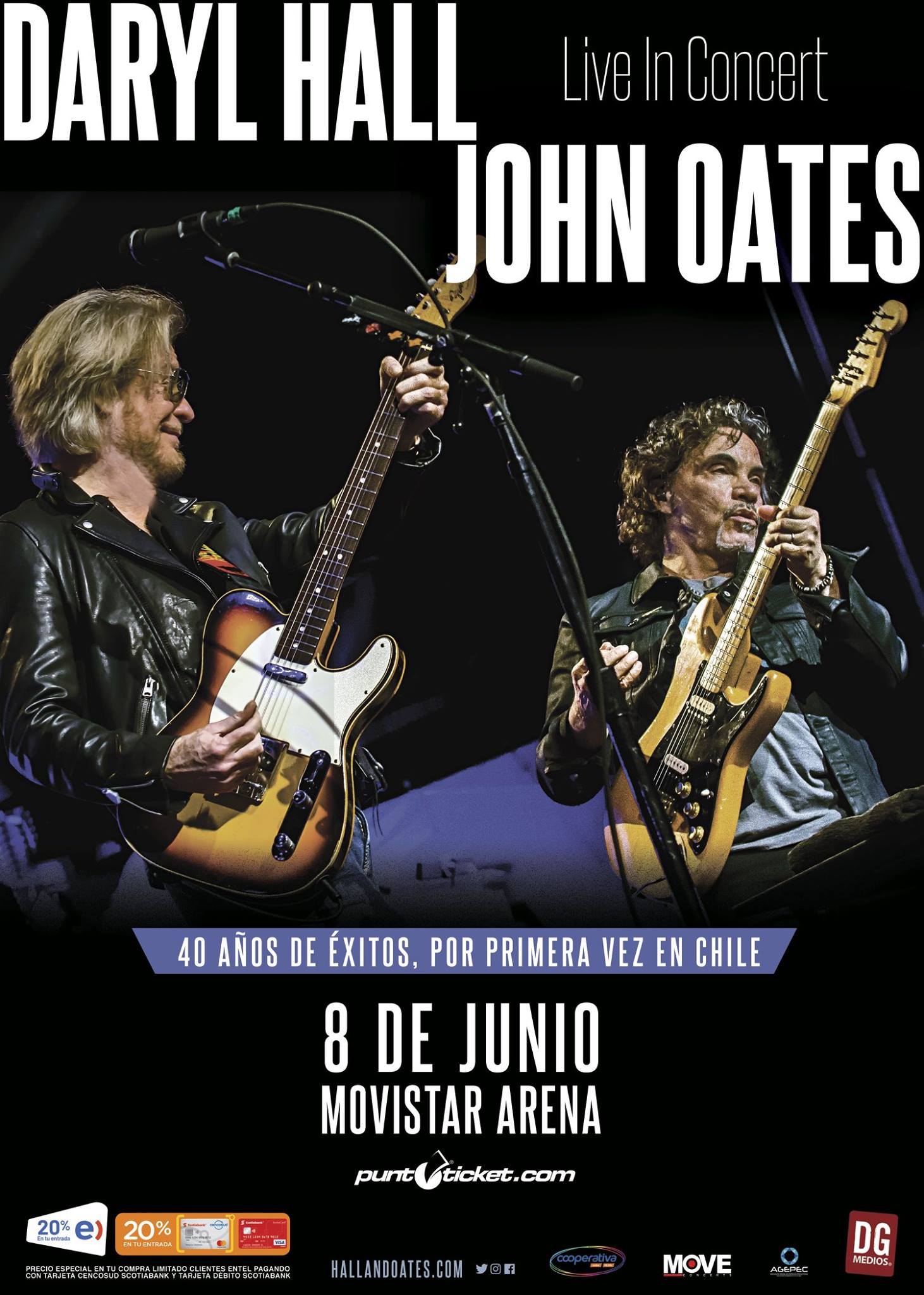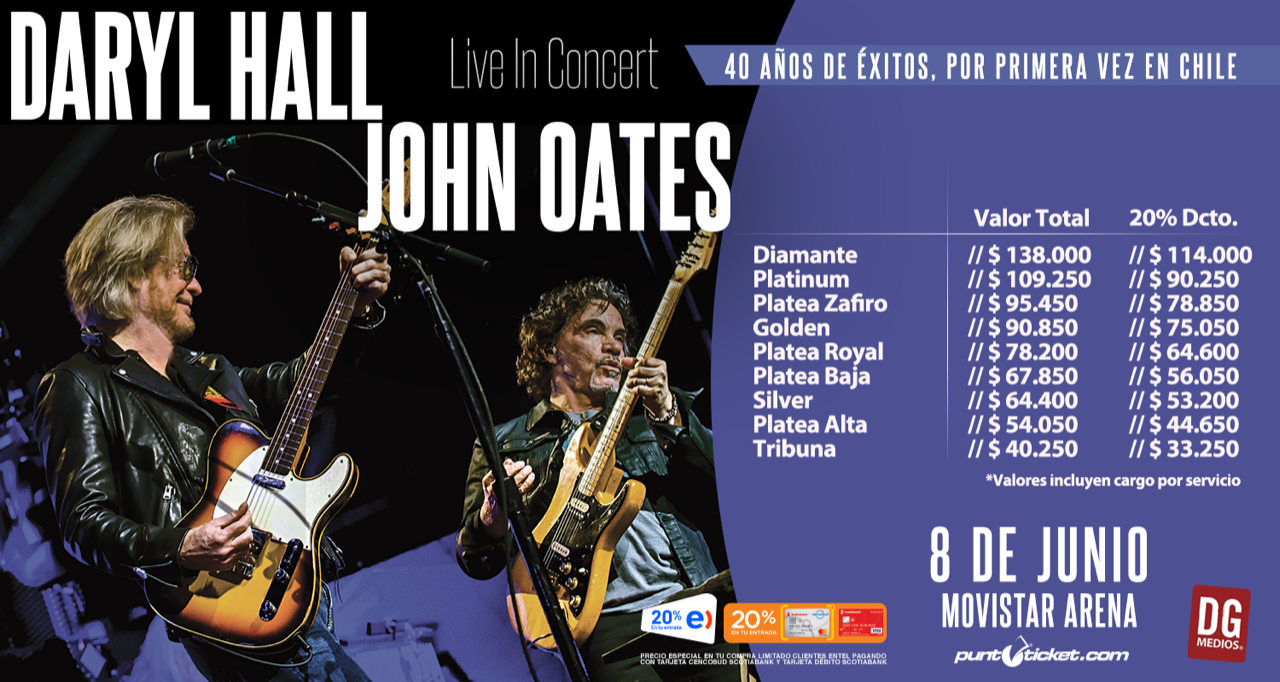 La preventa para el show de Daryl Hall & John Oates es exclusiva para clientes Entel pagando con Tarjeta Cencosud Scotiabank. Comienza el martes 5 de febrero a las 11am y estará disponible con un 20% de descuento para sus clientes hasta el jueves 7 de febrero, 11am o hasta agotar el stock de tickets disponibles para esta preventa.