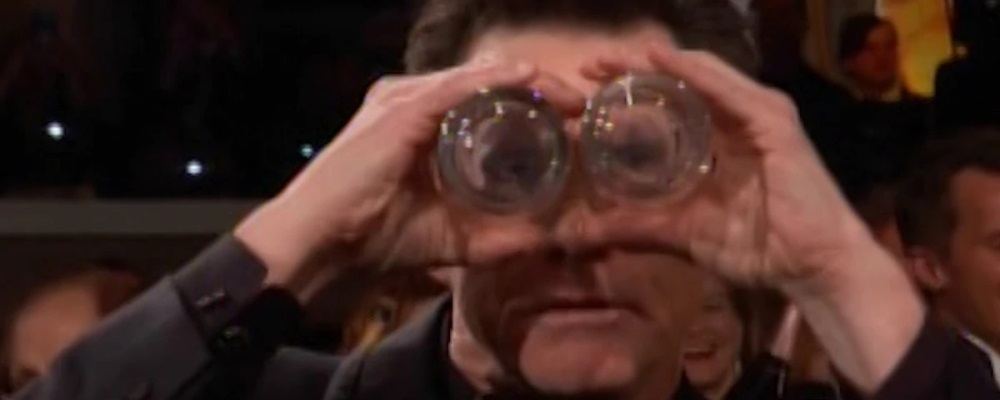 Para no perder la costumbre, el cómico canadiense de 56 años puso dos vasos sobre sus ojos –a modo de larga vista– haciendo referencia a que desde el fondo del salón, donde se encuentran los nominados de televisión, «todo llega con retraso».