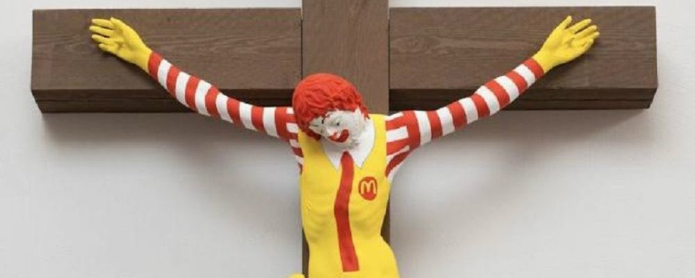 La obra del artista finlandés Jani Leinonen esta causando gran polémica en el mundo cristiano. Esto debido a que creo una escultura donde aparece el conocido personaje de comida rápida, Ronald McDonald personificando a Jesús en la cruz.