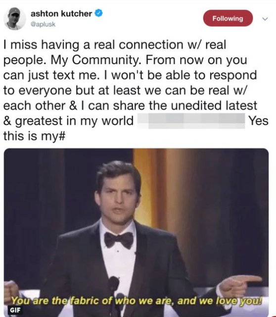 Ashton Kutcher sorprendió a sus millones de seguidores en las redes sociales al publicar su número de teléfono personal a través de su cuenta de Twitter.