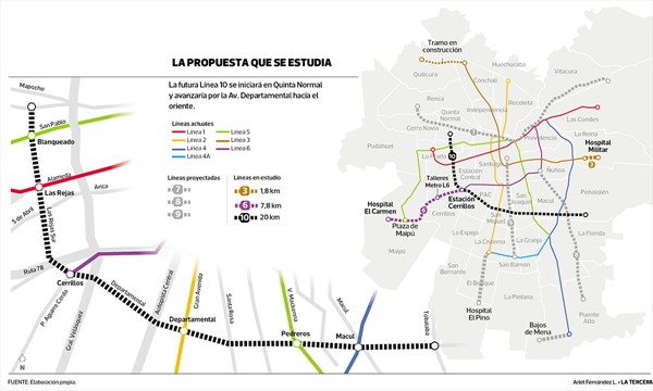 Es más, durante la jornada de ayer miércoles 23 de enero, el Gobierno mostró un diseño proyectado de la Línea 10 que poseerá una extensión de 20 kilómetros y que será construida de manera subterránea, al igual que las líneas 3 y 6. Se iniciaría en el sector de Mapocho, en Quinta Normal, y continuará hacia el sur hasta Av. Las Rejas, en Estación Central, donde combinará con Línea 1.