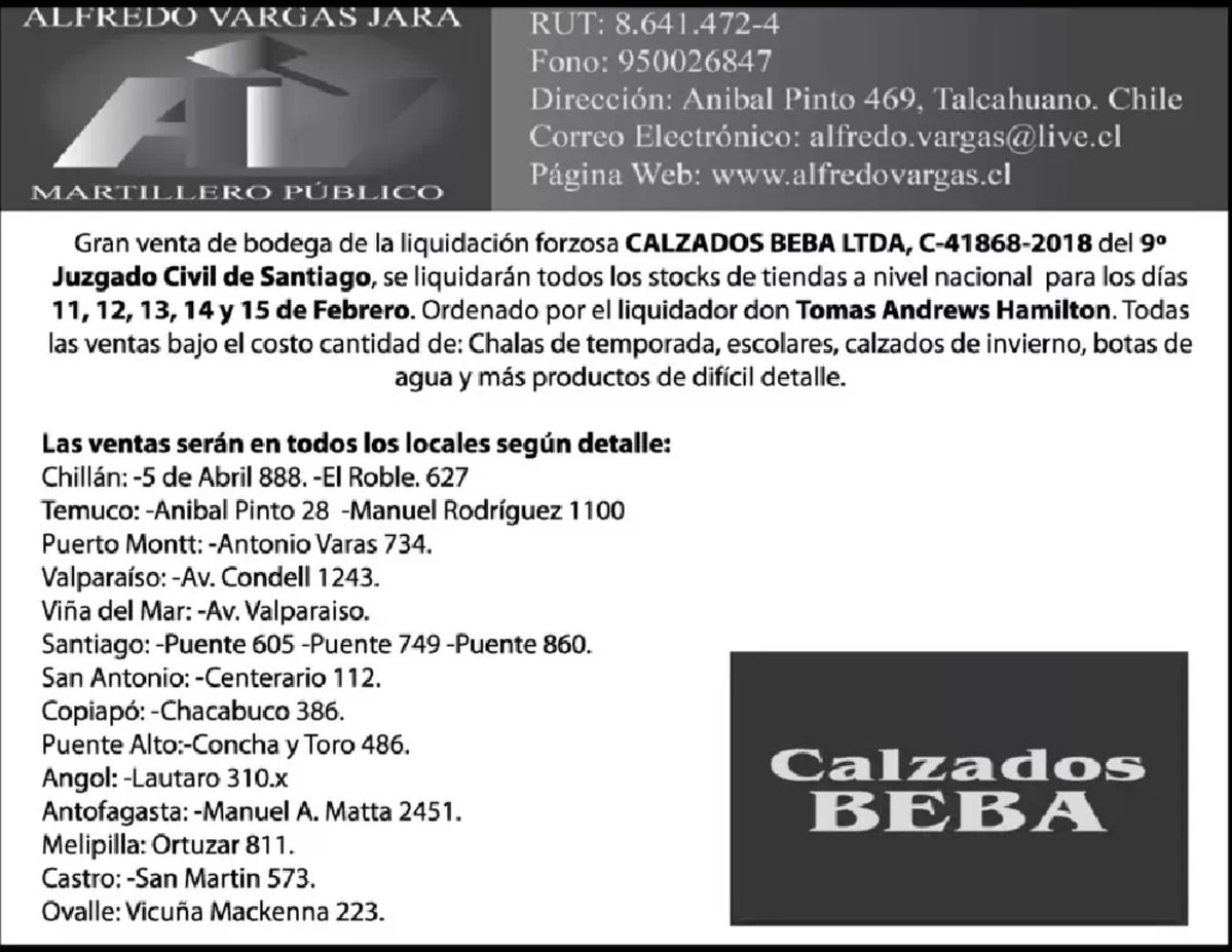 La noticia fue anunciada este domingo en El Mercurio, donde se publicó un aviso de remate: «Gran venta de bodega de liquidación forzosa CALZADOS BEBA LTDA, C-4168-2018 del 9° Juzgado Civil de Santiago, se liquidarán todos los stocks de tiendas a nivel nacional para los días 11, 12, 13, 14 y 15 de febrero».