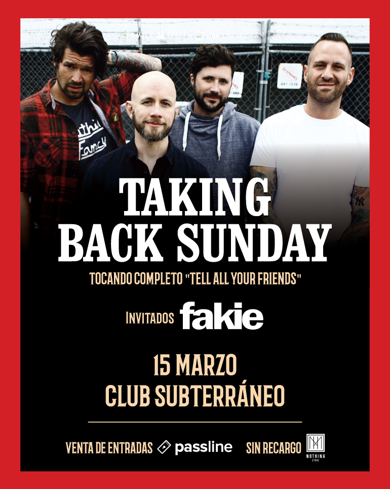 Y también hay tiempo para los que aún no tienen su entrada para Taking Back Sunday, el viernes 15 de marzo en el Club Subterráneo del pasaje Orrego Luco en Providencia. Las entradas están en sistema Passline y sin recargo en tienda Nothing, también de Providencia.