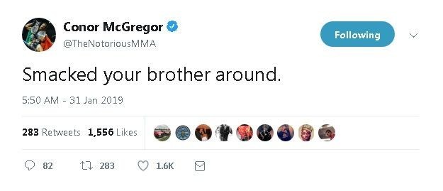 Pero no sólo eso, además se burló de un antiguo golpe que él le había propinado a un amigo de Khabib justo en el rostro, a modo de defensa.»Me lanzó un jab con la izquierda (el compañero de Khabib Nurmagomedov) e intentó protegerse con el guardia de seguridad, pero lo vi a una milla de distancia y lo conecté de lleno», señaló el irlandés adjuntando las imágenes.