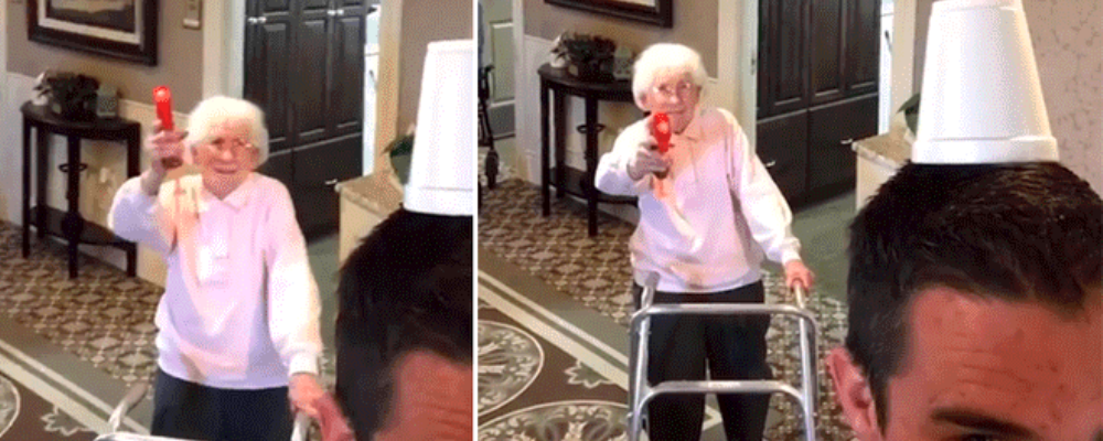 Para el desafío, el joven puso en su cabeza un vaso de plástico para que la mujer de canosa cabellera lanzara un balín de juguete y derribarlo. Desde la distancia, la matriarca demostró que las habilidades no tienen edad, y cuya imagen inmortalizada sacó risas entre médicos y auxiliares de su hogar de ancianos, y ahora, alrededor del mundo con más de 9 mil reproducciones y compartido en redes sociales.