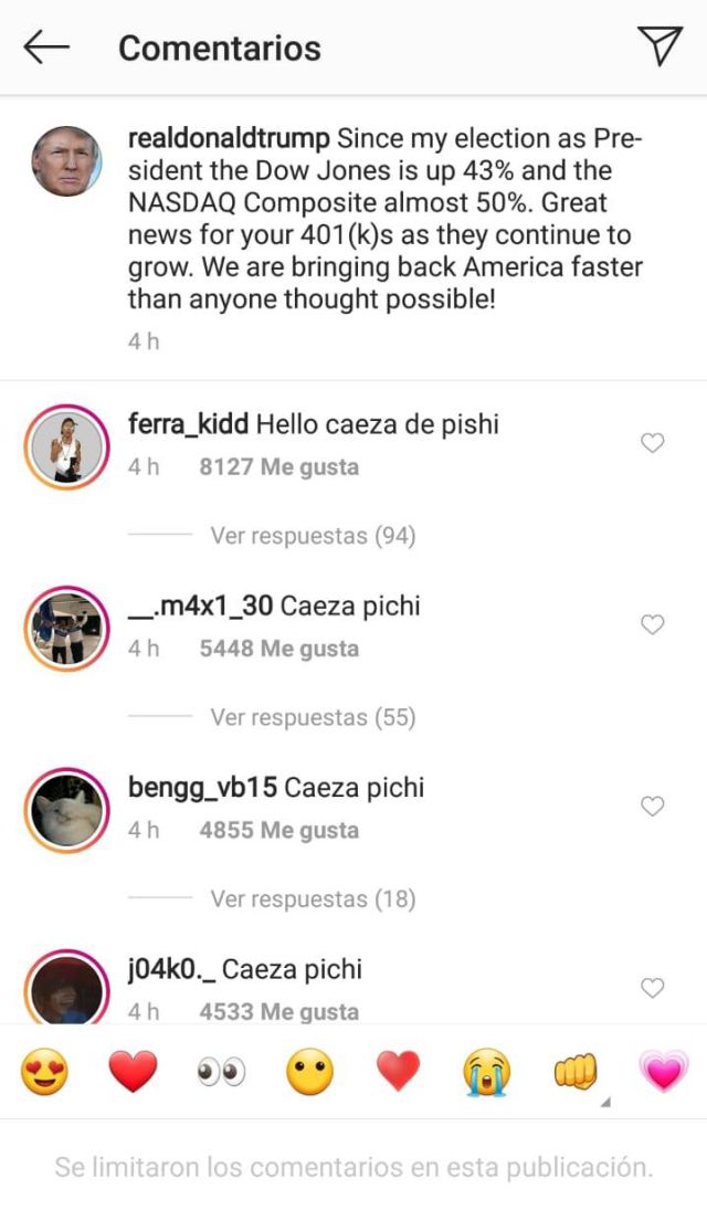 ACTITUD FUTURO Trump tuvo que cerrar comentarios en Instagram por el «Caeza e pichi» de Felipe Avello Fueron tantos los posteos siguiendo los consejos del comediante en su rutina en Viña 2019 que el Presidente de los Estados Unidos se llenó de dedicatorias. Por Hector Muñoz Tapia | 25 Feb, 2019. 18:34 hrs Fueron tantos los posteos siguiendo los consejos del comediante en su rutina en Viña 2019 que el Presidente de los Estados Unidos se llenó de dedicatorias. Hoy te contamos sobre la rutina de Felipe Avello en el Festival de Viña del Mar y su trolleo a Donald Trump, el que ocasionó que miles de personas le escribieran «caeza de pichí» al Presidente de los Estados Unidos. La cosa es que tanto ha sido el impacto del chiste del comediante que Trump tuvo que cerrar los comentarios de su cuenta oficial de Instagram. Donald Trump felipe avello Reggaetoneros de Viña 2019 "copiaron" look de Marilyn Manson en los Oscar Biff Byford, Saxon: "El metal está teniendo muy buenos años" Sigue a FUTURO.cl en Google Discover Recibe nuestros contenidos directamente en tu feed. Seguir en Google Contenido patrocinado