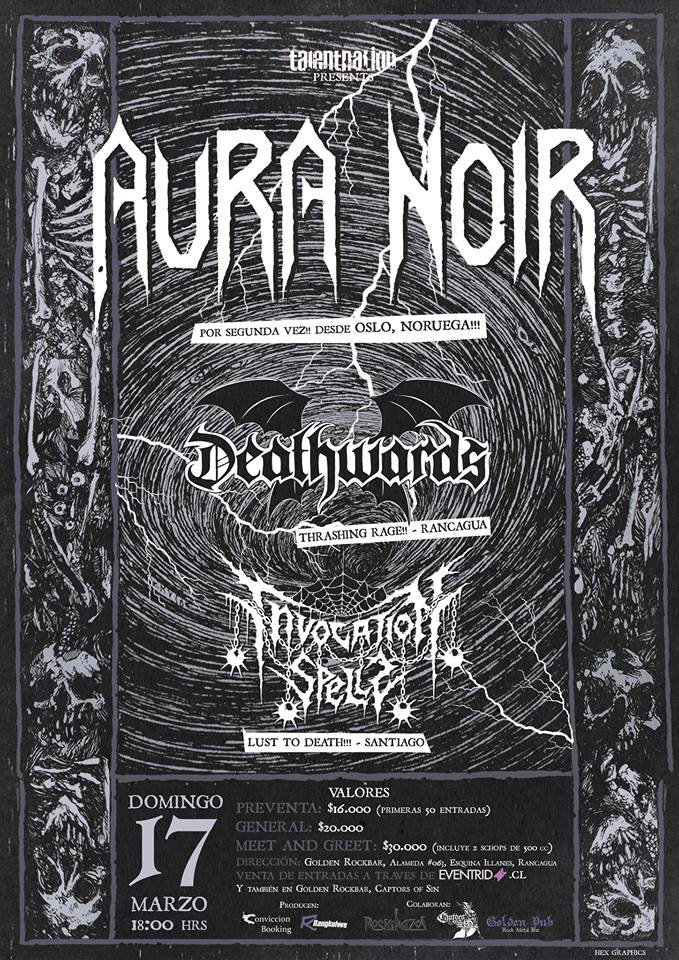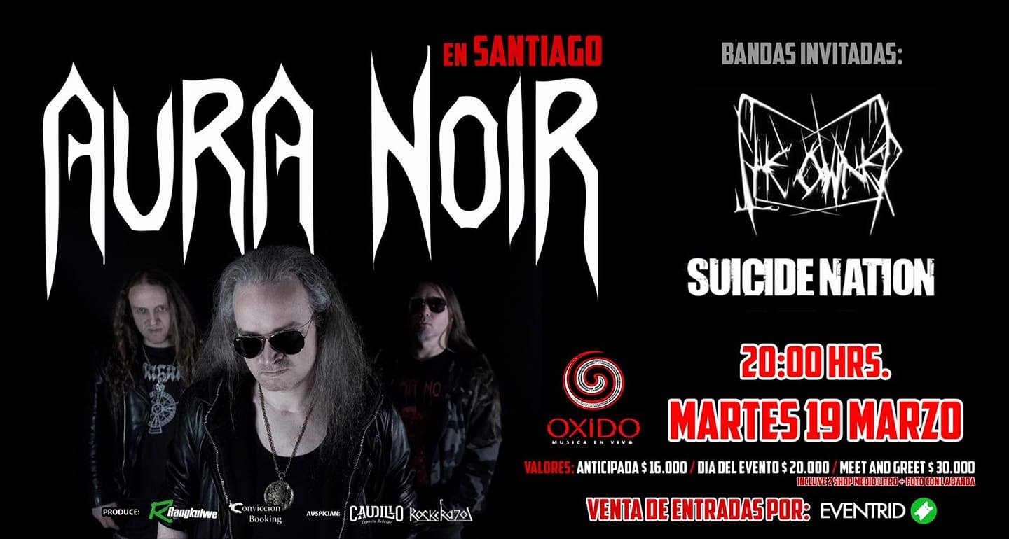 Noticias Aura Noir presentará su nuevo disco en Chile con fechas en Santiago y Rancagua La banda noruega de black thrash regresa a nuestro país en la segunda quincena de marzo. Por Jorge Lagas | 07 Mar, 2019. 17:48 hrs En las próximas semanas vuelven a Chile los noruegos Aura Noir, con la gira en que están mostrando su último disco «Aura Noire», lanzado el año pasado. Van a estar en Santiago y en Rancagua, primero en Rancagua el domingo 17 de marzo en el Golden Bar. Invitados: Invocation Spells y Deathwards. Y en Santiago, el martes 19 de marzo en el Bar Óxido del barrio Bellavista, bandas invitadas: The Owner y los talquinos Suicide Nation. Entradas para ambas fechas en Eventrid.cl, a $16.000 anticipada, $20.000 día del evento y $30.000 con meet & greet y 2 schops de medio litro. aura noir Pete Townshend de The Who anuncia el lanzamiento de su primera novela Attaque 77 realizará gira por la zona centro-sur de Chile presentando su nuevo material Sigue a FUTURO.cl en Google Discover Recibe nuestros contenidos directamente en tu feed. Seguir en Google Contenido patrocinado