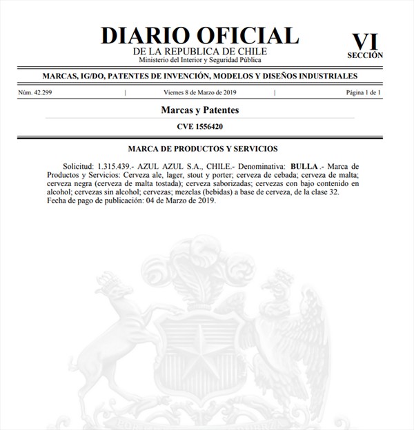 Azul Azul inscribió «Bulla» como nombre de marca de cerveza en el Diario Oficial