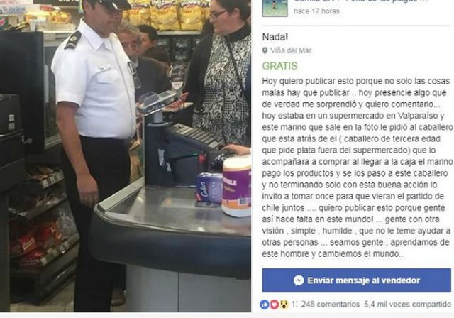 «Al llegar a la caja el marino pagó los productos y se los pasó a este caballero», continuó su relato en Facebook la mujer, agregando que además lo invitó a ver el partido de Chile a su casa.
