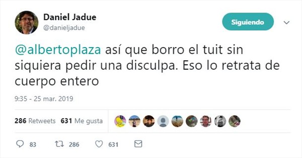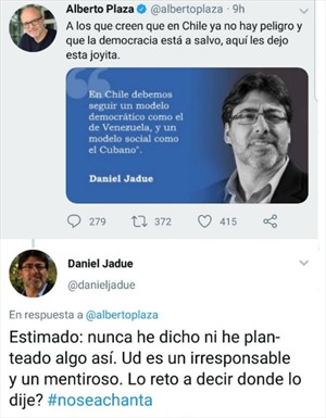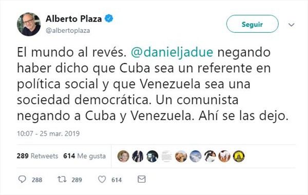 Pese a borrar su publicación admitiendo no encontrar la fuente, Plaza continuó: «El mundo al revés. @danieljadue negando haber dicho que Cuba sea un referente en política social y que Venezuela sea una sociedad democrática. Un comunista negando a Cuba y Venezuela. Ahí se las dejo».
