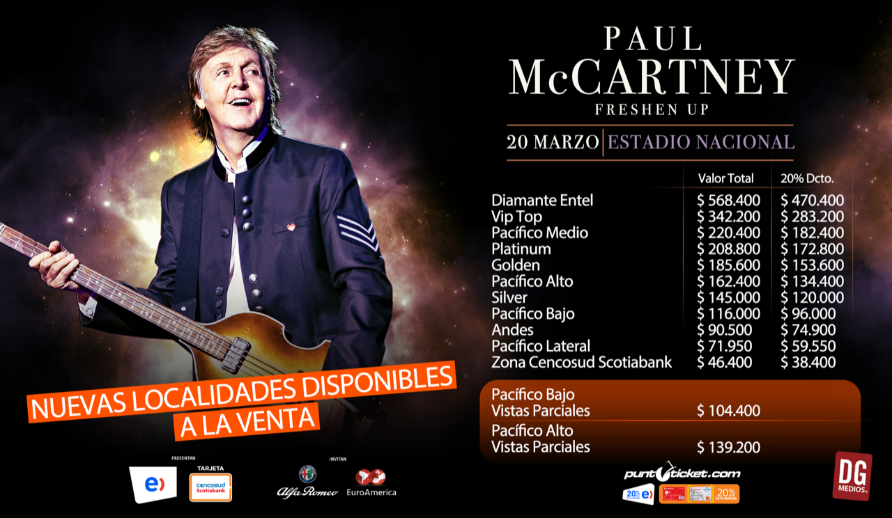 Noticias Nuevas localidades disponibles para Paul McCartney en Chile No te pierdas el regreso del músico vivo más influyente del planeta este miércoles 20 de marzo, en el Estadio Nacional. Por Hector Muñoz Tapia | 19 Mar, 2019. 09:40 hrs No te pierdas el regreso del músico vivo más influyente del planeta este miércoles 20 de marzo, en el Estadio Nacional. Solo queda un día. Paul McCartney ya está en Chile y mañana miércoles 20 de marzo dará su quinto show en nuestro país, y en su tercera vez en la cancha del Estadio Nacional, en la que será la primera fecha de 2019 de su gira Freshen Up con la que muestra «Egypt Station» de 2018, su más reciente y aclamado disco. Y en la previa al show, DG Medkos confirmó que se han abierto nuevas localidades, vistas parciales para Pacífico Bajo y Alto. Las entradas para Paul McCartney en Chile las encuentras en Puntoticket, con los siguientes precios: Estadio Nacional Paul McCartney Instituto Nacional definirá la posibilidad de convertirse en establecimiento mixto Meteorito chocó con la Tierra generando explosión 10 veces mayor a la bomba de Hiroshima Sigue a FUTURO.cl en Google Discover Recibe nuestros contenidos directamente en tu feed. Seguir en Google Contenido patrocinado