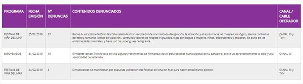 El segundo lugar del listado se lo ganó el vidente Ismael Torres, quien tocó en vivo algunas vestimentas de Fernanda Maciel para obtener nuevas pistas de su paradero en Canal 13, y de acuerdo a las denuncias, existe un aprovechamiento al dolor y a la sensibilidad de la familia. Mientras que el tercer lugar se lo llevó también el Festival de Viña, porque denunciantes se manifiestan por supuesta utilización del certamen «para hacer proselitismo político», ya que mencionaron en muchas ocasiones el conflicto en Venezuela.