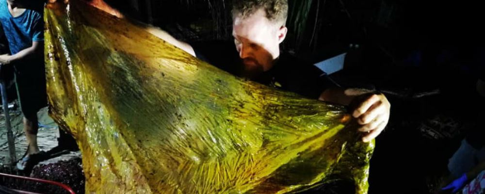 Al momento de la autopsia, los instigadores sacaban y sacaban plástico desde el estómago del cetáceo. Dentro del animal se encontraron 16 sacos de arroz, cuatro bolsas de las usadas en las plantaciones bananeras y numerosas bolsas de compra.