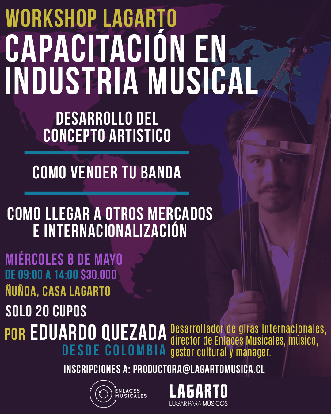 Este miércoles 8 de mayo, Eduardo Quezada músico contrabajista, Compositor y Gestor Cultural radicado en Colombia dictará el Workshop. “Capacitación en Industria Musical”, en una oportunidad única en la Casona Lagarto ubicada en Lincoyán 933 a las 9.00 am