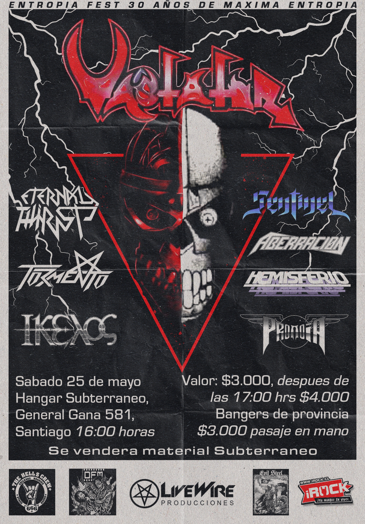 Este sábado 25 de mayo se conmemora los 30 años de uno de los trabajos más clásicos de la escena metalera nacional “MÁXIMA ENTROPÍA” y VASTATOR una de las bandas pioneras en el heavy-speed metal celebrarán en grande y junto a ellos las bandas más importantes de la escena heavy metal underground chilena: ETERNAL THIRST, ABERRACION, TORMENTO, SENTINEL, HEMISFERIO, IKELOS y PRONOIA en hangar subterráneo (General Gana N° 581 Metro Bio-Bio Línea 6) nuevo espacio que está naciendo dentro del circuito musical nacional.