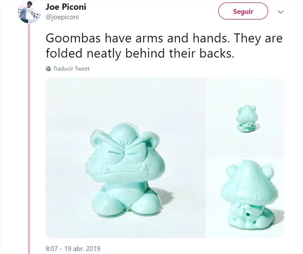 ACTITUD FUTURO ¡Crucial descubrimiento! Goombas de Mario Bros tienen manos y brazos Todo gracias a un usuario de Twitter que compartió la imagen de una antigua figura oficial de Nintendo. Por Diego Puebla Hernández | 22 Abr, 2019. 12:09 hrs Todo gracias a un usuario de Twitter que compartió la imagen de una antigua figura oficial de Nintendo. Finalmente se descubrió que los Goombas de Super Mario Bros., esos pequeños monstruos que debes aplastar para poder matarlos en el juego, sí tienen brazos además de manos. Un usuario de Twitter compartió una pequeña figura coleccionable -oficial de Nintendo- en donde se puede ver las características completas de los personajes, los cuales están ocultos en la espalda, según consigna el sitio Unocero. Este descubrimiento sorprendió a muchos fanáticos del clásico juego. mario bros John Bush y Charlie Benante interpretan canciones de Anthrax Goldberg, Vargas y Burgos: así es la nueva mesa de Azul Azul Sigue a FUTURO.cl en Google Discover Recibe nuestros contenidos directamente en tu feed. Seguir en Google Contenido patrocinado