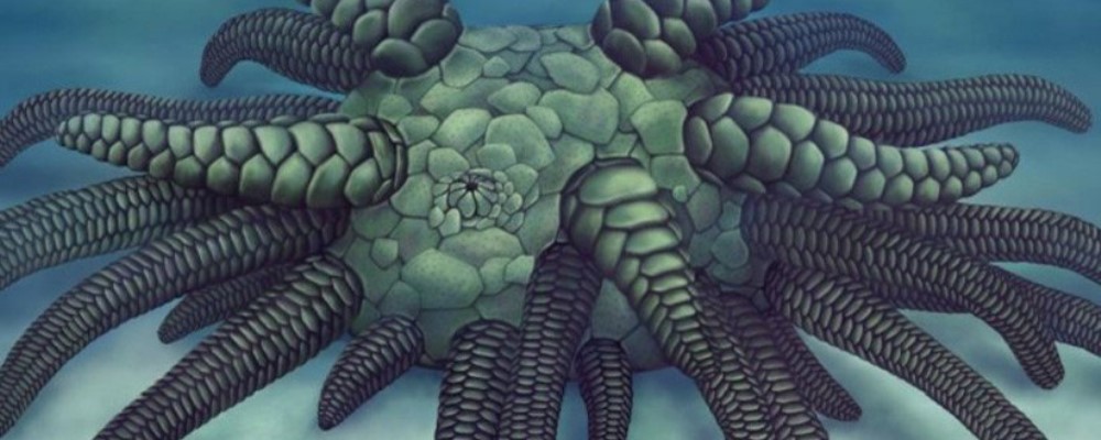 Descubren los restos bien conservados de una antigua criatura marina, pariente de los invertebrados conocidos como pepinos de mar. Su cuerpo medía tres centímetros y estaba completamente cubierto de placas óseas erizadas; contaba con 45 tentáculos blindados, que probablemente utilizaba para capturar alimentos y escabullirse por el fondo marino.