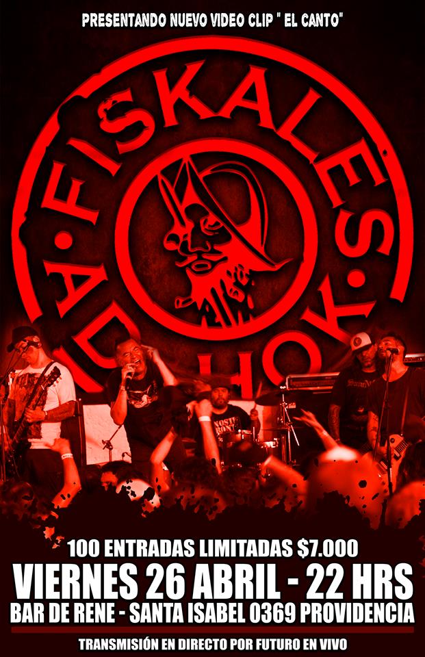 Noticias Fiskales Ad-Hok se presentarán en Bar de René y Futuro transmitirá en vivo Este viernes 26 de abril puedes ver a la emblemática banda en el local o vía Facebook Live de La Radio del Rock. Por Diego Puebla Hernández | 24 Abr, 2019. 13:41 hrs Este viernes 26 de abril puedes ver a la emblemática banda en el local o vía Facebook Live de La Radio del Rock. La emblemática agrupación de hardcore punk, Fiskales Ad-Hok, se presentarán en un íntimo show en Bar de René ubicado en Santa Isabel 369, comuna de Providencia. Esta ocasión servirá para abrir los fuegos de las sesiones Futuro Bar de René, que se transmiten en vivo y en directo por Facebook Live de La Radio del Rock. Las entradas están a 7.000 pesos en el mismo recinto, contactando a Somos Los Fiskales en Facebook o en las tiendas Cyco Récords Eurocentro y Cyco Récords Portal Lyon. Fiskales Ad-Hok Whatever: Felipe Avello sacó risas presentando su nuevo programa de televisión en inglés Dos canales nacionales se unen para la transmisión de Copa América Sigue a FUTURO.cl en Google Discover Recibe nuestros contenidos directamente en tu feed. Seguir en Google Contenido patrocinado