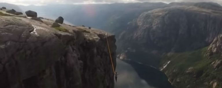 Uno de ellos es uno que quiso practicarlo a mil metros de altura entre dos acantilados en Kjerag, Noruega. Sin embargo, en un momento del trayecto el hombre pierde el equilibrio y cae.