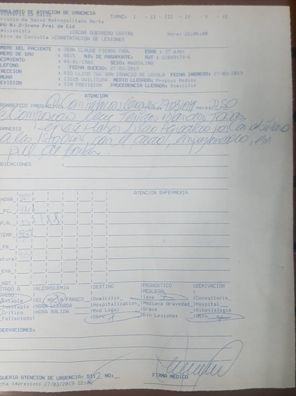 El funcionario la acompañó hasta el SAPU Rodrigo Rojas de Negri para constatar lesiones, donde presenció que otra ciudadana haitiana estaba presentando malestares en la sala de espera y botaba saliva por la boca.